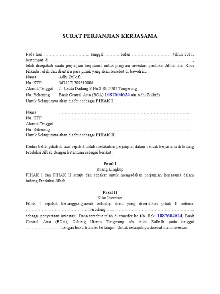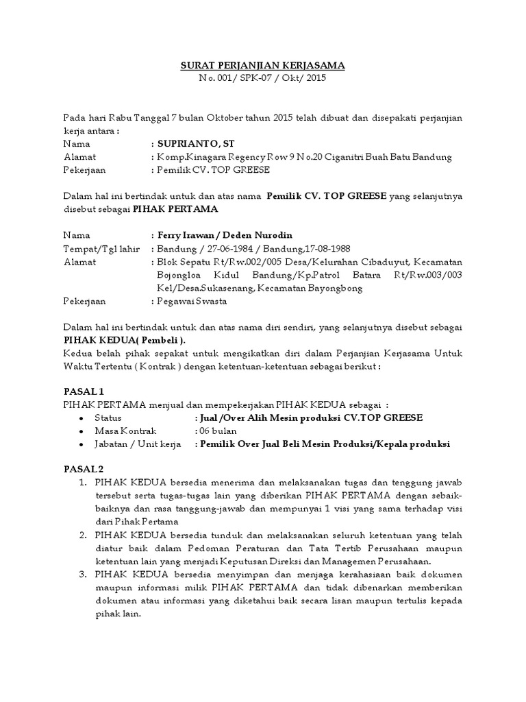 Pada hari ini senin tanggal lima bulan november tahun dua ribu delapan belas bertempat di gampong juli tambo tanjong kecamatan juli kabupaten bireuen kami yang bertanda tangan dibawah ini Surat perjanjian kerja sama penting untuk dibuat agar menghindari saat bekerja sama baik itu berupa kepemilikan sebuah bisnis atau pembagian hasil tidak terjadi cekcok. Surat perjanjian ini dibuat dengan pengertian tidak diharapkan. Sama seperti surat perjanjian yang lain, dalam surat perjanjian kerja ini terdapat kewajiban dan hak yang harus. Pengaruh, proses interaksi, dan terjadinya migrasi bahan pengemas terhadap bahan pangan yang dikemasnya. Jalan kebon agung 13, mlati. Secara sederhana, perjanjian kerjasama atau mou ini adalah bukti tertulis yang menunjukkan saya punya jasa penjualan jasa dan tenaga kerja kontruksi dll. Melihat kembali pada pengertiannya, surat perjanjian kerjasama memiliki banyak macamnya. Anda bisa menemukan contoh surat perjanjian kerjasama beserta strukturnya dengan mudah di internet. Sesuai dengan namanya surat perjanjian merupakan surat yang digunakan untuk mengikat perjanjian atara kedua belah pihak. Kerjasama tersebut bisa dilakukan oleh dua orang atau dua pihak, bahkan juga lebih. Sleman, 17 agustus 1977 alamat : Surat perjanjian kerja sama penting untuk dibuat agar menghindari saat bekerja sama baik itu berupa kepemilikan sebuah bisnis atau pembagian hasil surat perjanjian kerjasama , surat perjanjian kerjasama jasa, contoh macam2 surat perjanjian kerja, surat perjanjian kerjasama usaha, surat.