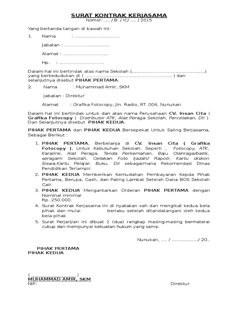 Kerjasama tersebut bisa dilakukan oleh dua orang atau dua pihak, bahkan juga lebih. Pada hari ini senin tanggal lima bulan november tahun dua ribu delapan belas bertempat di gampong juli tambo tanjong kecamatan juli kabupaten bireuen kami yang bertanda tangan dibawah ini Contoh surat perjanjian kerjasama usaha yang baik harus memenuhi sejumlah syarat tertentu. Sebelum mengunduh surat perjanjian sewa ruko kios di bagian bawah artikel untuk mendownload contoh surat kerjasama bagi hasil dalam format doc silahkan klik link yang tersedia berikut ini. Melihat dari manfaat dan isi surat perjanjian kerja sama usaha di atas, kita tentu sudah dapat menggambarkan poin apa saja yang harus dimasukkan dalam surat perjanjian kerjsa sama usaha. Indojaya makmur memiliki keahlian dalam mencetak advertising dan seperti pembuatan desain, percetakan kalender, percetakan undangan, buku profil sekolah serta buku kenangan, karena merupakan bidang yang kami jalani. Contoh surat perjanjian kerjasama rumah makin / cafe. Melihat kembali pada pengertiannya, surat perjanjian kerjasama memiliki banyak macamnya. Anda bisa menemukan contoh surat perjanjian kerjasama beserta strukturnya dengan mudah di internet. Download contoh surat perjanjian kerja, surat yang mengikat hubungan kedua belah pihak selama periode waktu kerja tertentu. Surat perjanjian kerjasama antara pelaksana kegiatan dan penyedia barang/jasa. Contoh surat perjanjian kerjasama dalam bisnis jasa usaha dan investasi bila saat ini anda sedang atau mau menjalin sebuah usahabisnis dengan rekanteman anda maka buatlah sebuah perjanjian tertulis. Apabila dalam surat perjanjian jual beli objeknya benda atau barang, maka objek pada surat perjanjian kerja ialah jasa kerja dan layanan dari kedua belah pihak di dalam surat.